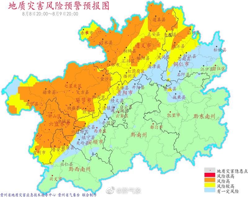 贵州省气象台于8月8日下午发布地质灾害气象风险预报,预计8月8日20时—8月9日20时:贵州省的中北部地区有一定的地质灾害气象风险,其中,遵义市中北部、毕节市北部地区地质灾害风险较高,其余地区的地质灾害气象风险低,请注意防范!(总台央视记者 杨晓东)