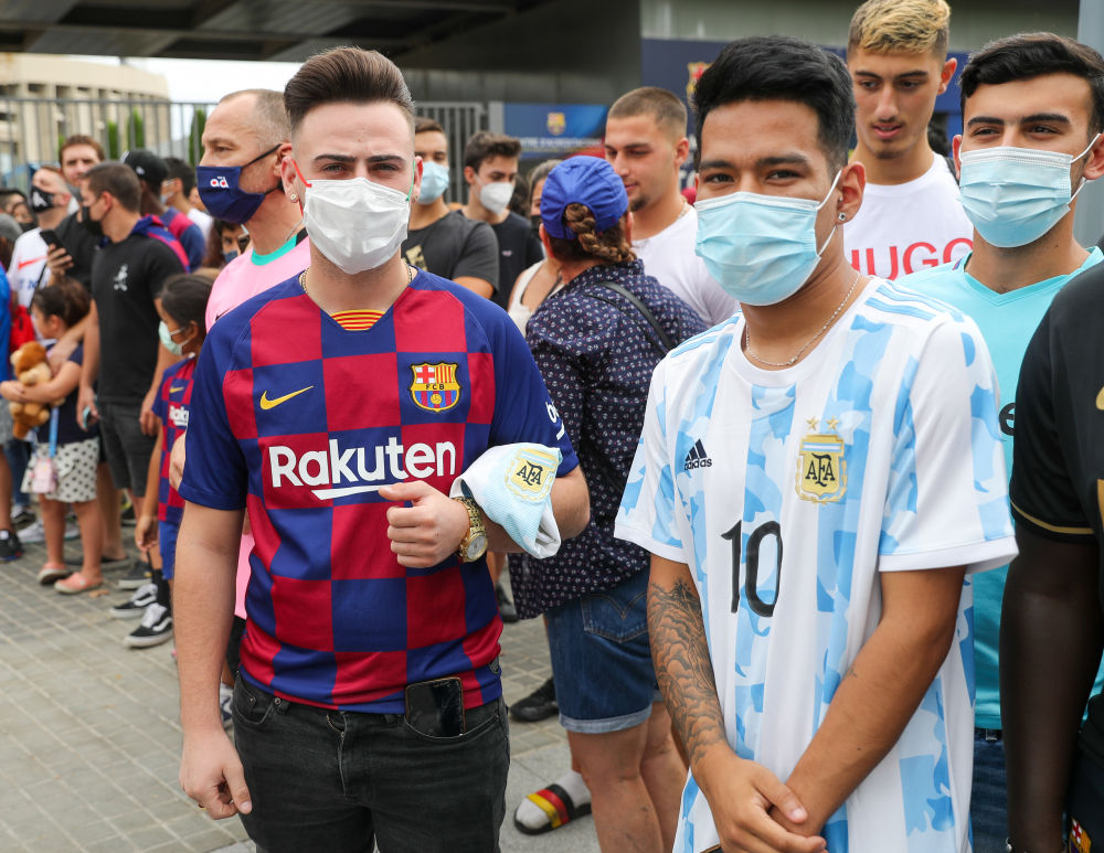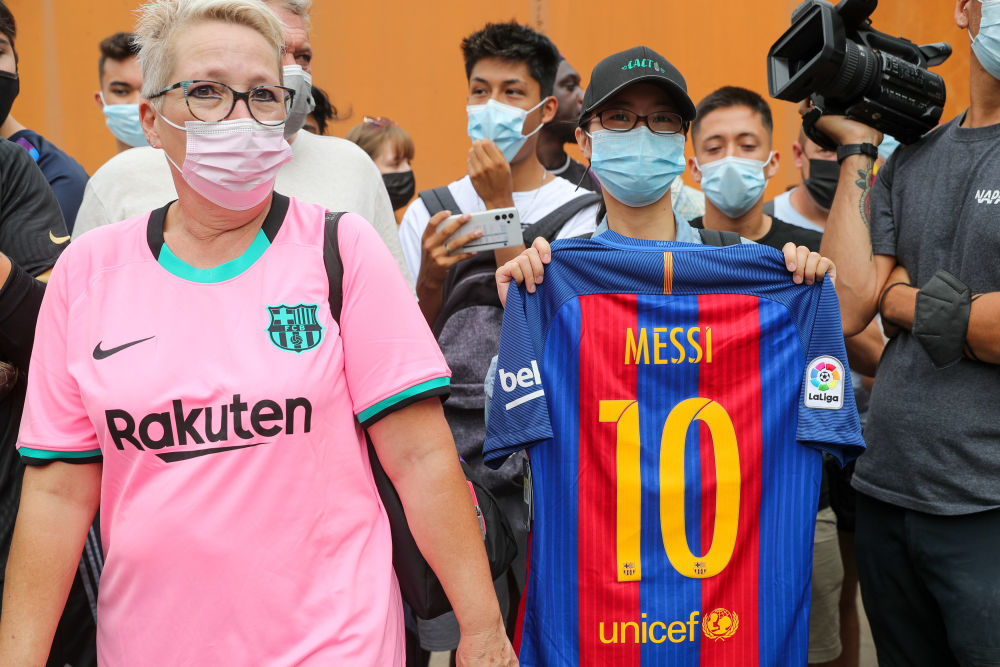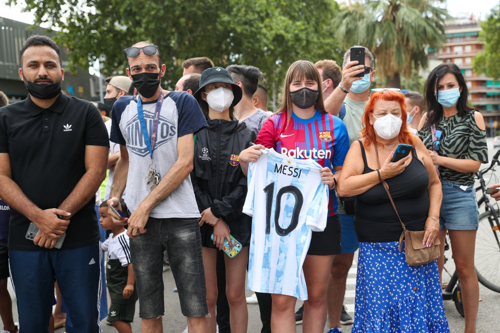 ↑球迷在巴塞罗那俱乐部外等待梅西。新华社发