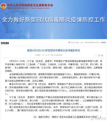 截至8月8日24时,据31个省(自治区、直辖市)和新疆生产建设兵团报告,现有确诊病例1603例(其中重症病例49例),累计治愈出院病例87587例,累计死亡病例4636例,累计报告确诊病例93826例,现有疑似病例1例。累计追踪到密切接触者1127361人,尚在医学观察的密切接触者48314人。