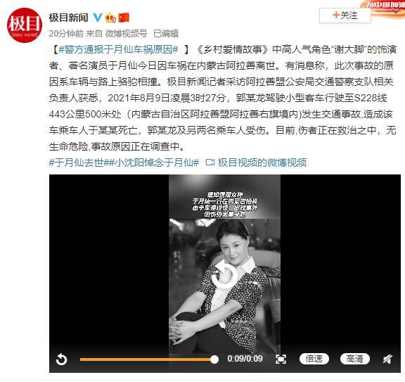 《乡村爱情故事》中高人气角色“谢大脚”的饰演者、著名演员于月仙被传今日因车祸在内蒙古阿拉善离世。极目新闻记者采访阿拉善盟公安局交通警察支队相关负责人获悉,今日凌晨时分阿拉善右旗交警大队接到事故信息,立刻出警。记者刚刚获得的官方通告称,2021年8月9号凌晨3时30分左右,于月仙乘坐的SUV车辆与路上的两只骆驼发生碰撞,事故造成于月仙不幸遇难,司机及其他乘车人受伤,两只骆驼死亡。