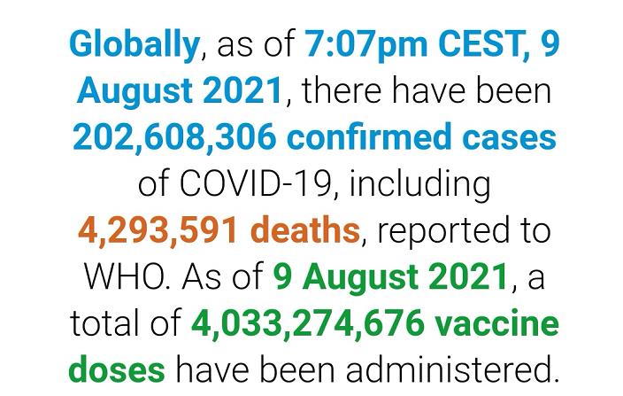 根据世卫组织最新实时统计数据,截至欧洲中部夏令时间8月9日19时07分(北京时间8月10日1时07分),全球累计新冠肺炎确诊病例202608306例,累计死亡病例4293591例。