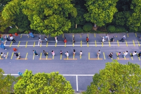 8月9日,市民在扬州市江都区玉带社区核酸检测采样点排队(无人机照片)。新华社发