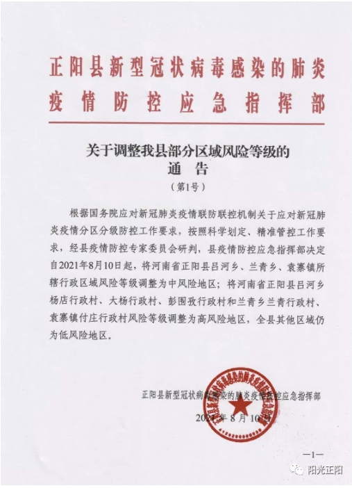 “阳光正阳”微信公众号消息,正阳县新型冠状病毒感染的肺炎疫情防控应急指挥部8月10日通报,根据国务院应对新冠肺炎疫情联防联控机制关于应对新冠肺炎疫情分区分级防控工作要求,按照科学划定、精准管控工作要求,经县疫情防控专家委员会研判,县疫情防控应急指挥部决定自2021年8月10日起,将河南省正阳县吕河乡、兰青乡、袁寨镇所辖行政区域风险等级调整为中风险地区,将河南省正阳县吕河乡杨店行政村、大杨行政村、彭围孜行政村和兰青乡兰青行政村、袁寨镇付庄行政村风险等级调整为高风险地区,全县其他区域仍为低风险地区。