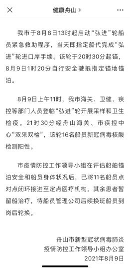 8月9日11时,舟山海关、卫健、疾控等部门人员登临“弘进”轮开展采样和卫生检疫。当天21时30分经舟山海关、舟山市疾控中心“双采双检”,该轮16名船员新冠病毒核酸检测阳性。