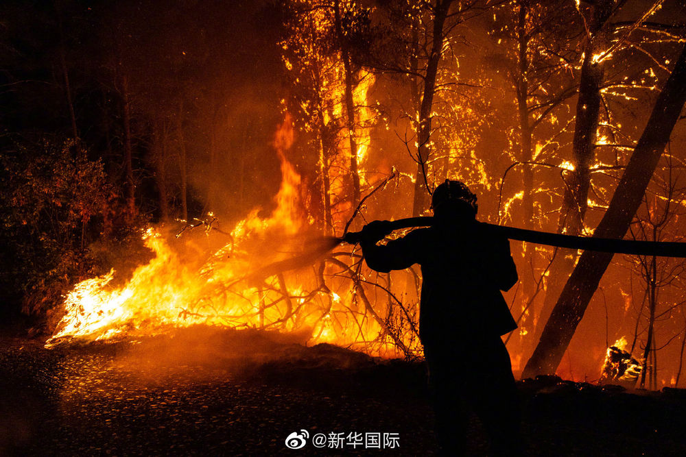 图为8月5日,消防员在希腊雅典北部的山火现场灭火。