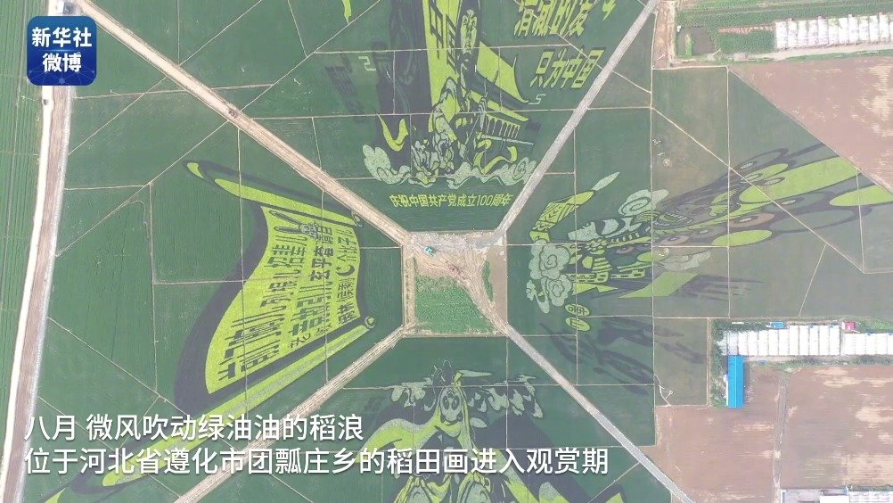 #稻田为纸水稻为笔这画真美#【壮观!#巨幅稻田画惊艳亮相河北农村#】八月,微风吹动绿油油的稻浪,位于河北省遵化市团瓢庄乡的稻田画进入观赏期。从空中俯瞰,一幅幅精美的稻田画在广阔大地上铺展开来,美不胜收。稻田画占地面积约1600亩,勤劳的农民以稻田为纸、水稻为笔,创作出包含皮影、唐山话等唐山元素图案和以庆祝中国共产党成立100周年为主题的稻田画作品;通过艺术创意,打造农旅融合发展新亮点。(记者高博) 新华社的微博视频