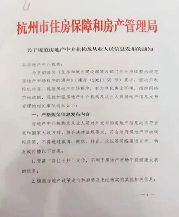 央视网消息:据杭+新闻客户端消息,杭州住保房管消息称,为贯彻落实《住房和城乡建设部等8部门关于持续整治规范房地产市场秩序的通知》要求,坚决抑制投机炒房,规范房地产市场秩序,有力净化舆论环境,维护网络空间清朗,今天,杭州市住房保障和房产管理局在房地产中介市场秩序整治阶段性工作推进会上,向各房地产中介机构下发了《关于规范房地产中介机构及从业人员信息发布的通知》。杭州住保房管局要求各中介机构从严格规范信息发布内容、切实加强信息发布管理、严肃查处违法违规信息三个方面,首次对中介机构及从业人员信息发布的管理提出了明确要求。