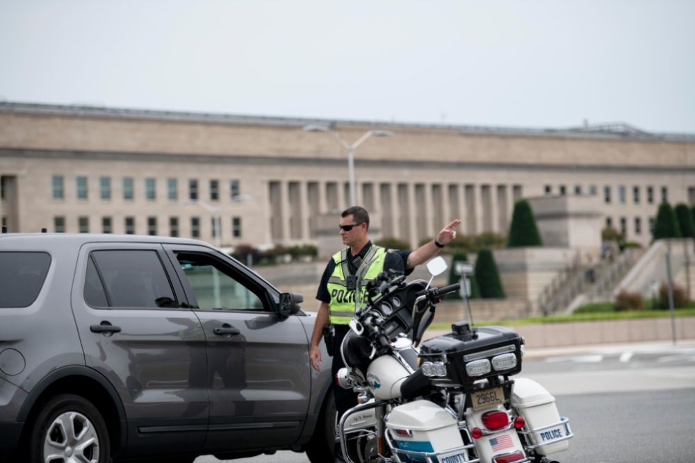 8月3日,一名警察在美国弗吉尼亚州阿灵顿的五角大楼附近执勤。(新华社记者刘杰摄)
