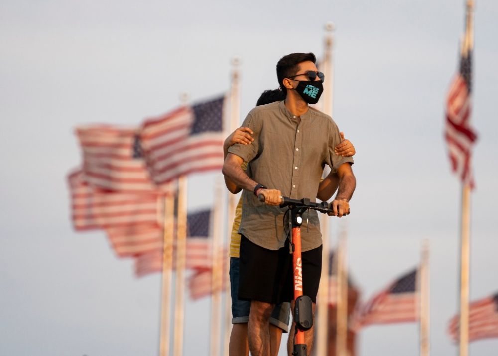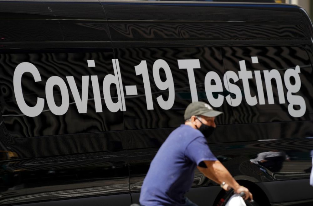 8月2日,一名男子骑车经过美国纽约街头的新冠检测点。(新华社记者王迎摄)