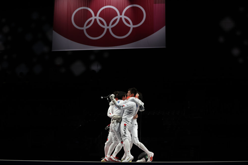 7月30日,日本队选手在东京奥运会击剑项目男子重剑团体金牌争夺战后庆祝。
