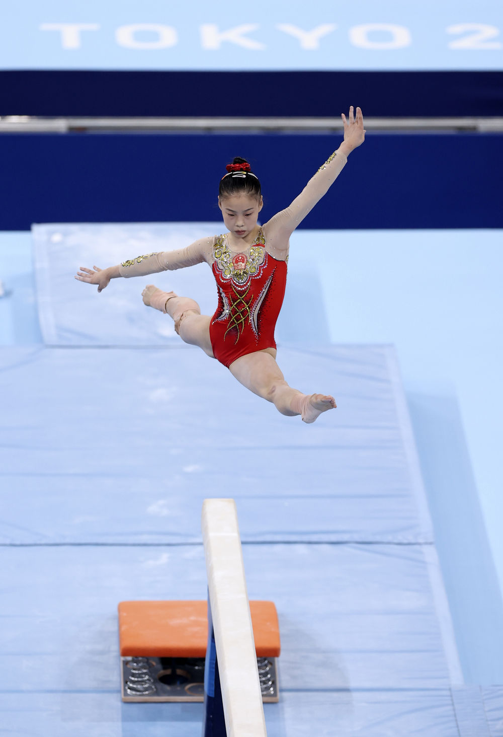 7月22日,日本选手平岩优奈在日本东京有明体操体育馆平衡木上训练。