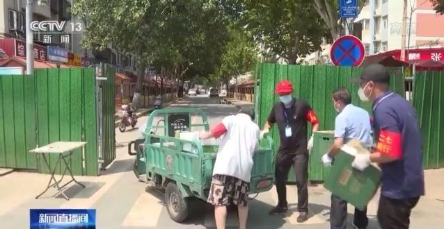 在郑州京广路街道高风险区域,记者看到,沿街商铺都已停业,为了保障物资运输,主干道仍然保持正常通行,但是通往封闭小区的支路、背街,都已经用围挡封闭。这就意味着,物资和人员到达这个卡点后就不能再往里进了。于是,由办事处、机关下沉党员及居民志愿者就承担起了物资的接力运输工作。