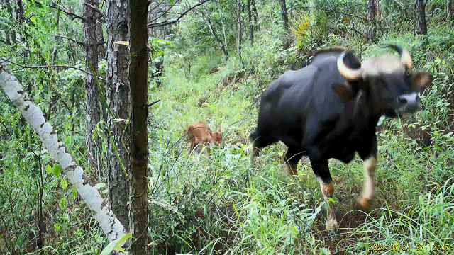 画面中显示,一头体型壮硕,全身除了头顶、牛角以及四肢呈白色外,其余均为黑色的成年野牛正穿过一片林子,一头全身黄色的小牛幼崽紧跟在它身后。这一大一小两头牛就是国家一级保护动物亚洲野牛。