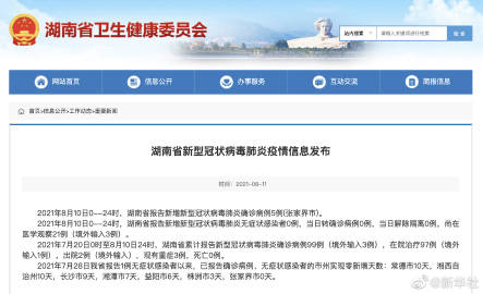 【#10日湖南新增确诊病例5例均在张家界#】据湖南省卫健委网站,2021年8月10日0--24时,湖南省报告新增新型冠状病毒肺炎确诊病例5例(张家界市)。