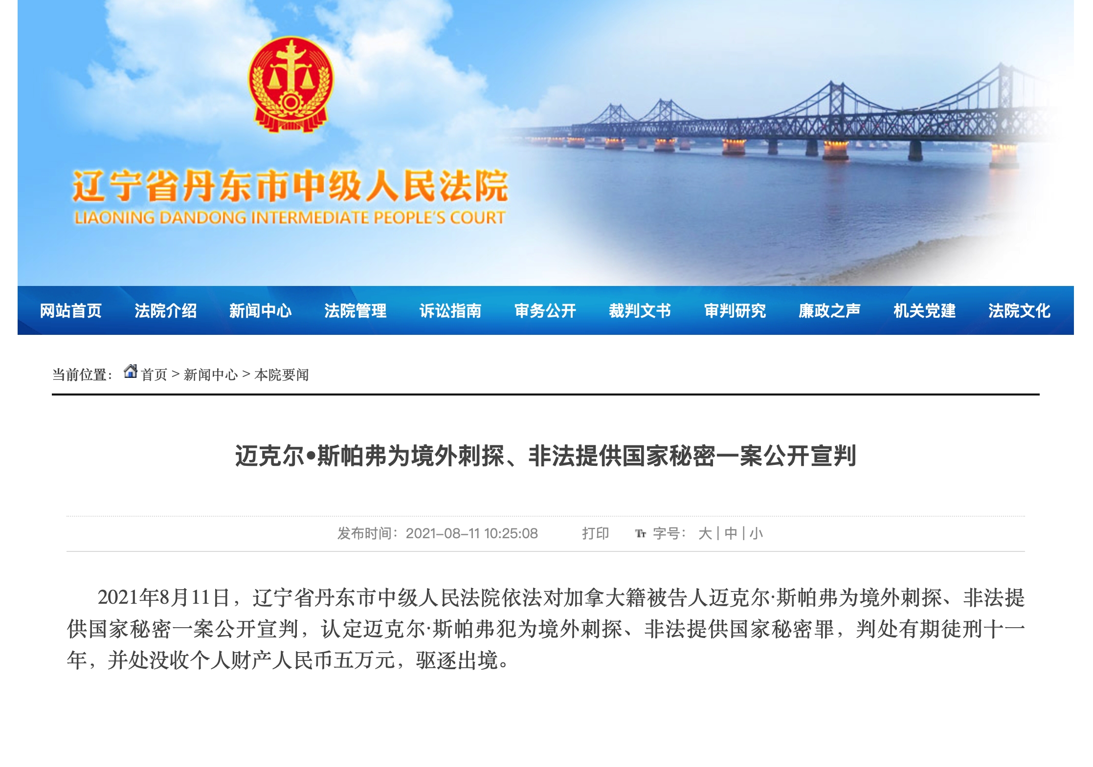 2021年8月11日,辽宁省丹东市中级人民法院依法对加拿大籍被告人迈克尔·斯帕弗为境外刺探、非法提供国家秘密一案公开宣判,认定迈克尔·斯帕弗犯为境外刺探、非法提供国家秘密罪,判处有期徒刑十一年,并处没收个人财产人民币五万元,驱逐出境。