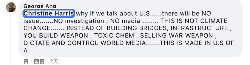 另一位名为Georae Ana的网友则对西方主流媒体发出了“灵魂拷问”:“为什么我们一谈论到美国,就没有问题,没有调查,没有媒体报道?……这不是建造桥梁、基础设施,是建造武器、有毒化学品、销售武器、控制世界媒体。这都是美国制造。”