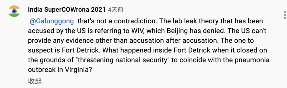 的确,通过莫须有的调查和个别外媒的虚假报道进行舆论造势,这就是美国诬陷中国的惯用伎俩。一名印度网友也指出:“除了一次又一次的指责,美国无法提供任何证据。”他表示,德特里克堡更值得怀疑,它以 “威胁国家安全 ”为由关闭,与此同时弗吉尼亚州的肺炎病例激增,里面究竟发生了什么?