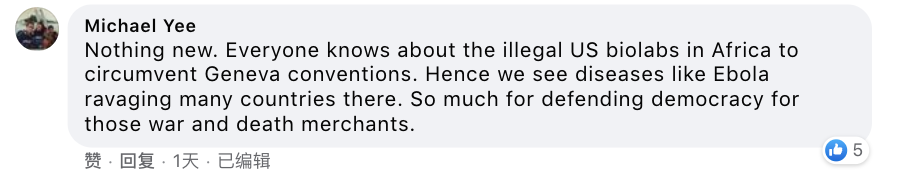 有的网友则丝毫不奇怪,表示这是美国的“常规操作”。一名叫Michael Yee的网友表示,美国为了规避国际公约,在非洲设有多个非法的生物实验室。