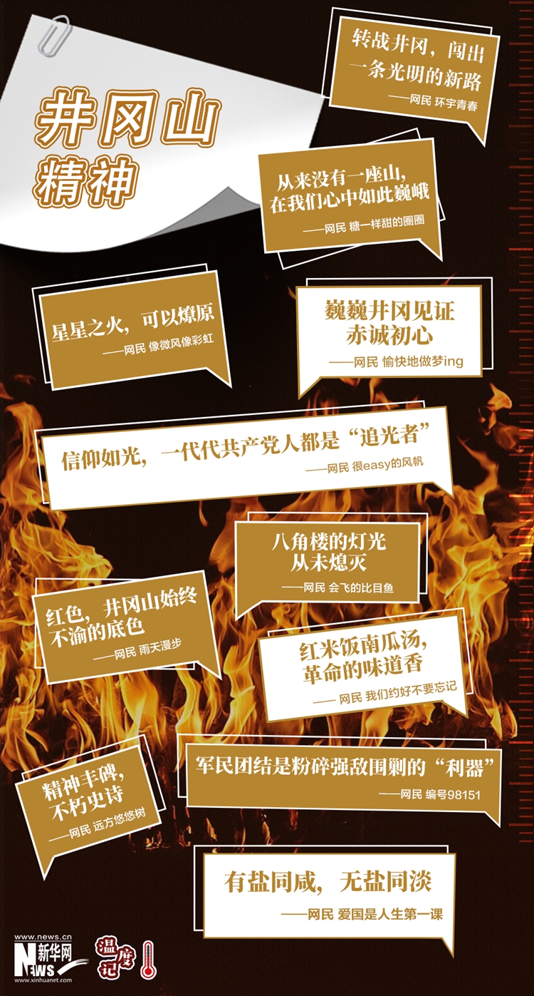 星星之火,终成燎原之势。精神之光,烛照着中国革命一步步迈向成功,指引着中华民族伟大复兴的新征程。挑粮的小道,八角楼的灯光,黄洋界的炮声……抚今追昔,一个个铭刻在历史上的印记,愈发熠熠生辉,震撼人心、砥砺前行。在社交平台上,许多网民纪念那段峥嵘的井冈岁月,写下对历史的告白,坚定对精神的传承。(文字:马若虎 海报设计:王晔)