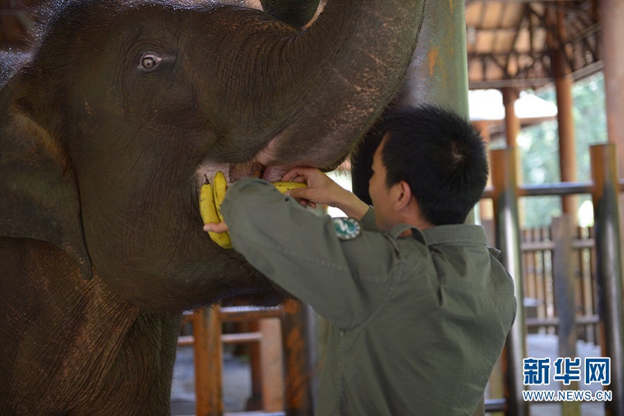 初到繁育救助中心时,“然然”的伤势一度很严重,意外受伤的它腿上伤口肌肉已开始腐烂,创面深可见骨。为了尽快治愈“然然”的腿伤,治疗小组挖空心思寻找治疗方案,每天打针、上药所带来的疼痛让它对人类有了排斥。为了方便治疗,熊朝永开始对“然然”进行简单驯化,并开始“出任”它的“象爸”。