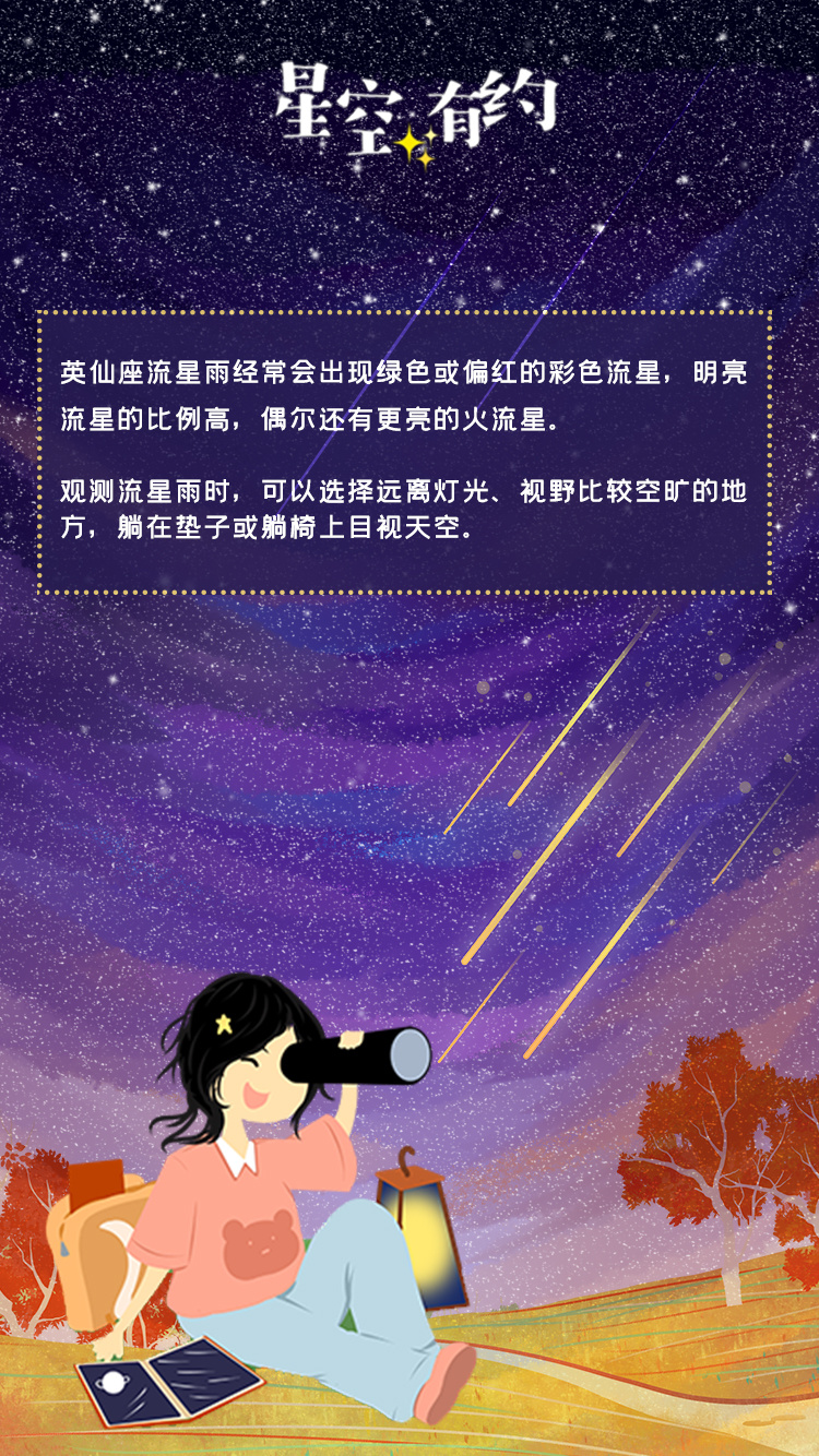 “观测流星雨时,可以选择远离灯光、视野比较空旷的地方,躺在垫子或躺椅上目视天空即可,不必盯着辐射点看。”王科超说,英仙座流星雨经常会出现绿色或偏红的彩色流星,明亮流星的比例高,偶尔还有更亮的火流星。