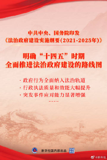 【#权威快报#|#我国确立今后五年法治政府建设路线图#】中共中央、国务院近日印发的《法治政府建设实施纲要(2021-2025年)》确立了今后五年法治政府建设的总体目标,明确到2025年,政府行为要全面纳入法治轨道。纲要还提出,着力实现行政执法水平普遍提升,努力让人民群众在每一个执法行为中都能看到风清气正、从每一项执法决定中都能感受到公平正义。(记者白阳,海报设计杨轶群)