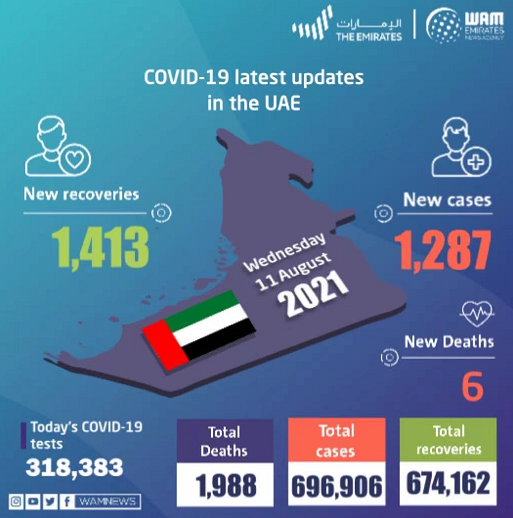据阿联酋卫生与预防部当地时间8月11日公布的数据,阿联酋当天新增1287例新冠肺炎确诊病例,新增1413例治愈病例,新增6例死亡病例。截至目前,阿联酋累计确诊病例696906例,累计治愈674162例,累计死亡1988例。