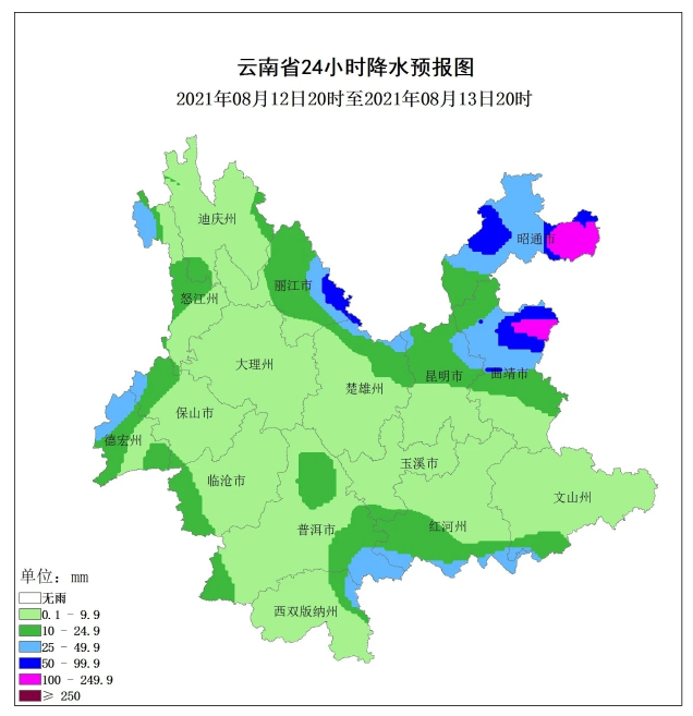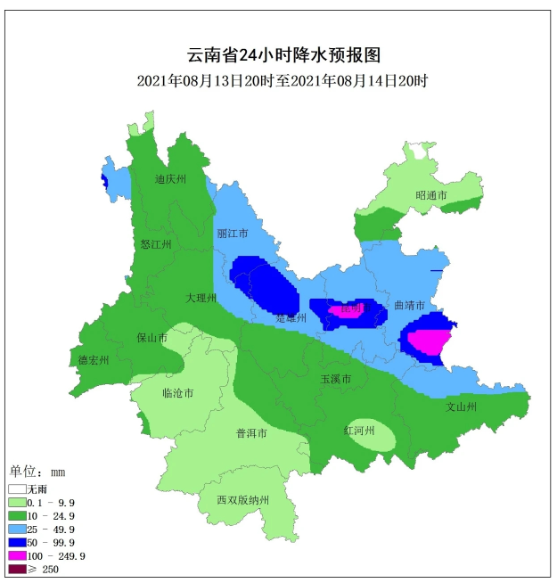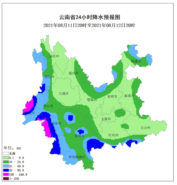 据预报,2021年8月12日,保山、德宏、怒江南部阴有中到大雨局部暴雨、大暴雨,怒江北部、临沧西部、普洱南部、红河南部、昭通北部多云间阴有小到中雨局部大雨,其他地区多云有阵雨局部中雨。滇西、滇南、滇中有雷暴、短时强降水,局地大风、冰雹等强对流天气;13日,昭通北部、曲靖北部、丽江东部、楚雄北部、昆明北部阵雨转中到大雨局部暴雨、大暴雨,怒江北部、保山北部、德宏北部、普洱东南部、红河南部多云间阴有小到中雨局部大雨,其他地区多云有阵雨局部中雨;14日,曲靖、文山北部、昆明、楚雄、丽江东部、大理西北部阴有中到大雨局部暴雨、大暴雨,迪庆、怒江、保山西部、德宏、文山南部、红河、玉溪多云间阴有小到中雨局部大雨,其他地区多云有阵雨局部中雨。