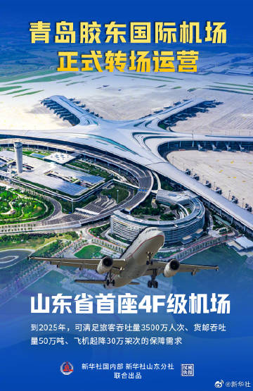 【#权威快报#|#青岛胶东国际机场正式转场运营#】8月12日零时,青岛胶东国际机场正式实施转场运营,青岛流亭国际机场同步关闭。青岛胶东国际机场的设计运行等级与北京大兴国际机场、上海浦东国际机场相当,均为国内民航最高的4F级。该机场是山东省首座4F级机场,也是中国民航首批18个“智慧型机场”示范项目之一。规划到2025年,可满足旅客吞吐量3500万人次、货邮吞吐量50万吨、飞机起降30万架次的保障需求。