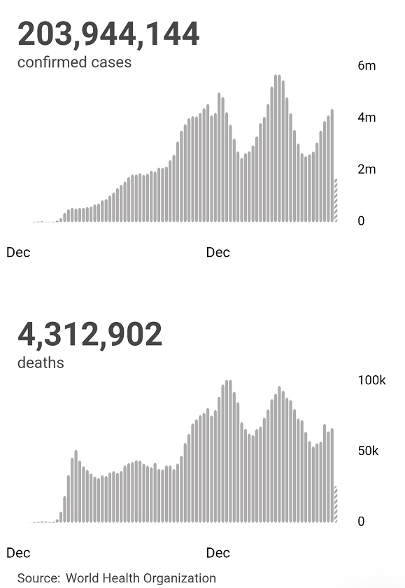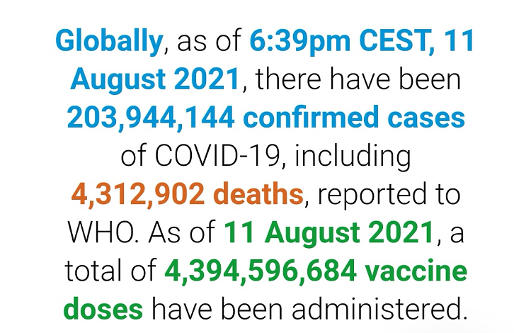 根据世卫组织最新统计数据,截至欧洲中部夏令时间8月11日18时39分(北京时间8月12日零时39分),全球累计新冠肺炎确诊病例达203944144例,累计死亡病例4312902例。11日全球新增新冠肺炎确诊病例630656例,新增死亡病例9178例。(总台记者 薛婧萌)