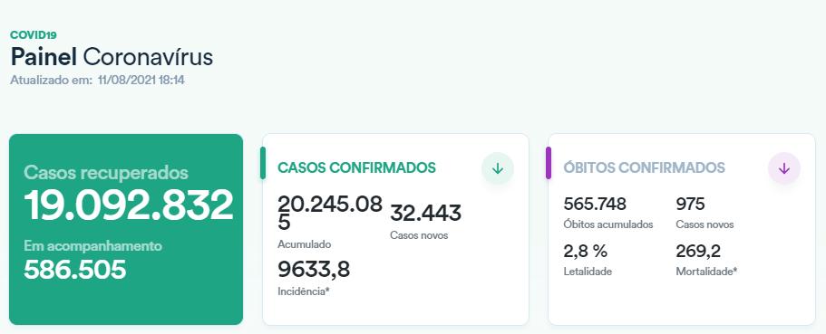 截至当地时间8月11日18时14分,据巴西卫生部发布的数据,该国单日新增新冠肺炎确诊病例32443例,累计确诊20245085例;新增死亡病例975例,累计死亡565748例;累计治愈19092832例。