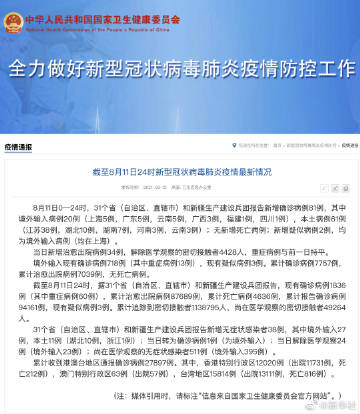 截至8月11日24时,据31个省(自治区、直辖市)和新疆生产建设兵团报告,现有确诊病例1836例(其中重症病例60例),累计治愈出院病例87689例,累计死亡病例4636例,累计报告确诊病例94161例,现有疑似病例3例。累计追踪到密切接触者1138795人,尚在医学观察的密切接触者49264人。