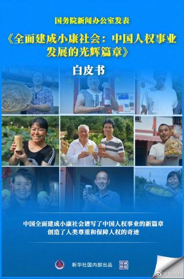 【#权威快报#|全面建成小康社会是#中国人权事业发展光辉篇章#】国务院新闻办公室12日发表《全面建成小康社会:中国人权事业发展的光辉篇章》白皮书。白皮书说,中国全面建成小康社会,夯实了人权基础,丰富了人权内涵,拓宽了人权视野,意味着人权的全面发展和全民共享,谱写了中国人权事业的新篇章,创造了人类尊重和保障人权的奇迹。(记者高蕾、王琦、范思翔,海报制作张晨光 )