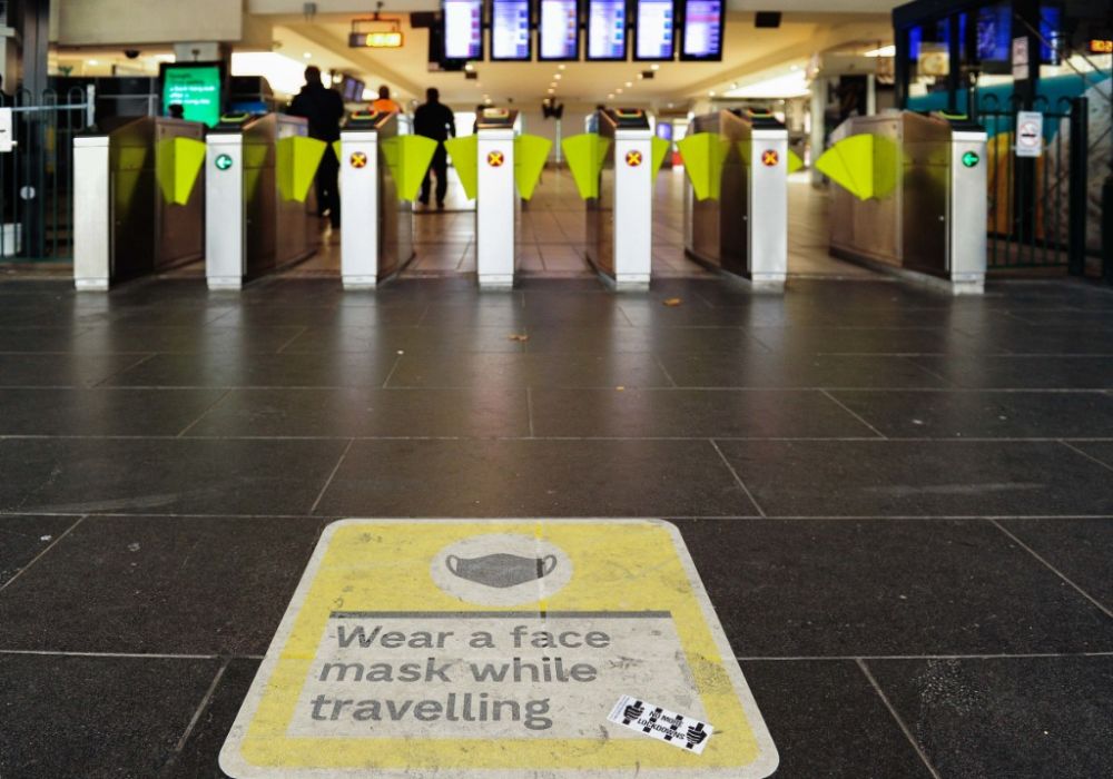 5月28日,在澳大利亚墨尔本,火车站的地面上贴着提示人们佩戴口罩的标示。(新华社发,白雪摄)
