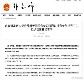 【外交部发言人#华春莹就美国国会参议院通过涉台参与世界卫生组织议案答记者问#】