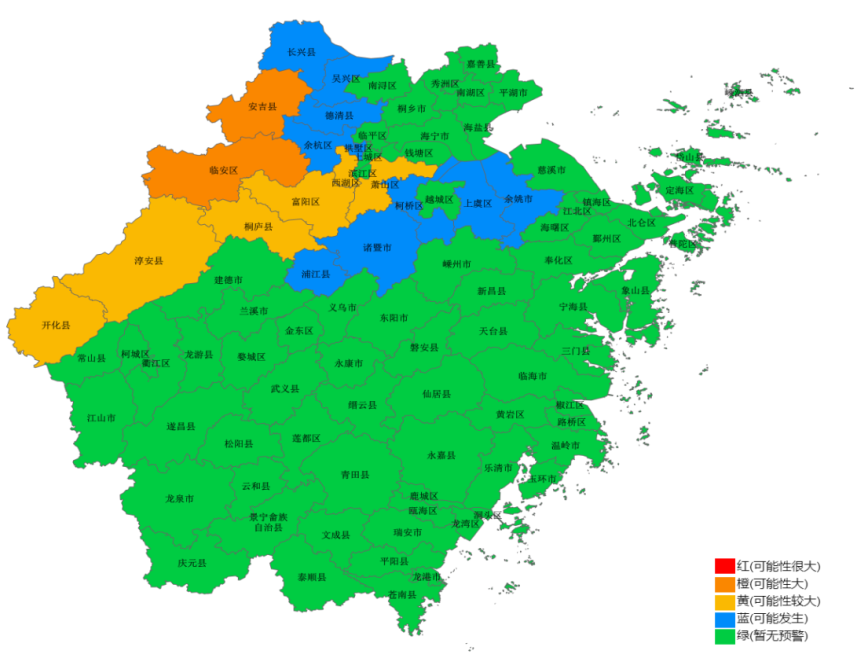 浙江省水利厅8月12日17时30分发布山洪灾害预警:根据浙江省气象台未来降雨预报,预计8月12日20时至13日20时,杭州市拱墅区、余杭区,宁波市余姚市,湖州市吴兴区、德清县、长兴县,绍兴市柯桥区、上虞区、诸暨市,金华市浦江县可能发生山洪灾害(蓝色预警),杭州市西湖区、萧山区、富阳区、桐庐县、淳安县,衢州市开化县发生山洪灾害可能性较大(黄色预警),杭州市临安区、湖州市安吉县发生山洪灾害可能性大(橙色预警)。 (总台记者 李佳)