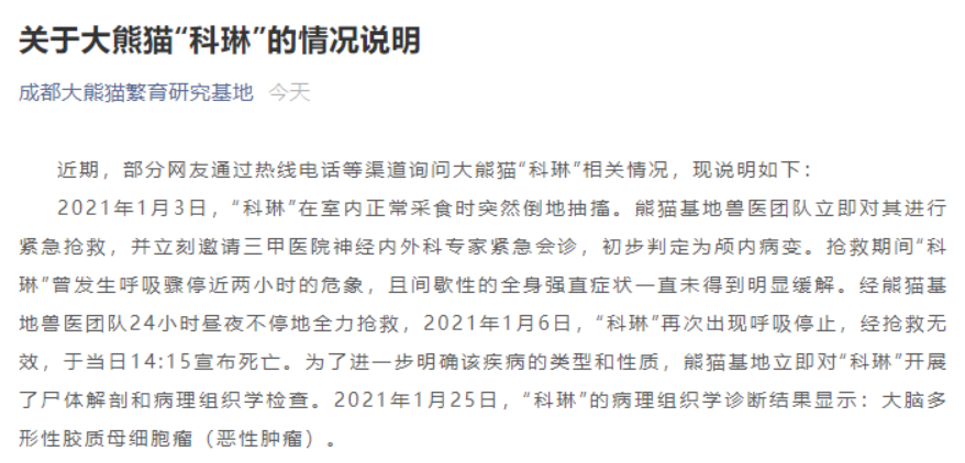 2021年1月3日,“科琳”在室内正常采食时突然倒地抽搐。熊猫基地兽医团队立即对其进行紧急抢救,并立刻邀请三甲医院神经内外科专家紧急会诊,初步判定为颅内病变。抢救期间“科琳”曾发生呼吸骤停近两小时的危象,且间歇性的全身强直症状一直未得到明显缓解。经熊猫基地兽医团队24小时昼夜不停地全力抢救,2021年1月6日,“科琳”再次出现呼吸停止,经抢救无效,于当日14时15分宣布死亡。为了进一步明确该疾病的类型和性质,熊猫基地立即对“科琳”开展了尸体解剖和病理组织学检查。2021年1月25日,“科琳”的病理组织学诊断结果显示:大脑多形性胶质母细胞瘤(恶性肿瘤)。