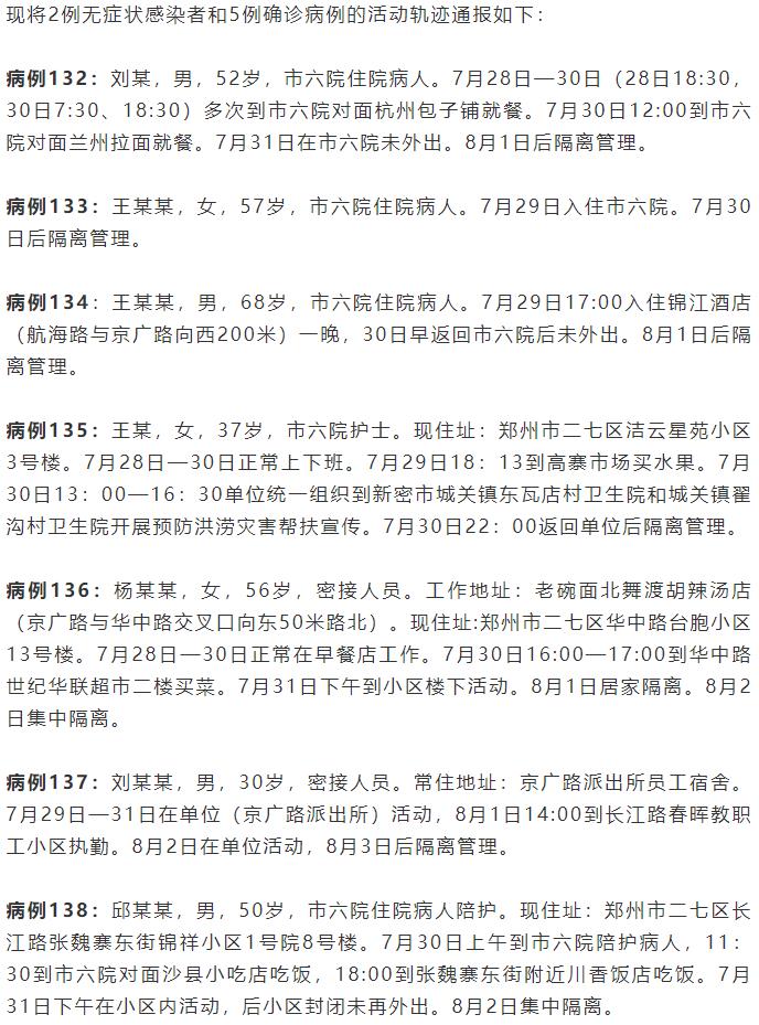 河南省郑州市新冠肺炎疫情防控领导小组办公室8月12日通报2例无症状感染者和5例确诊病例的活动轨迹,具体如下: