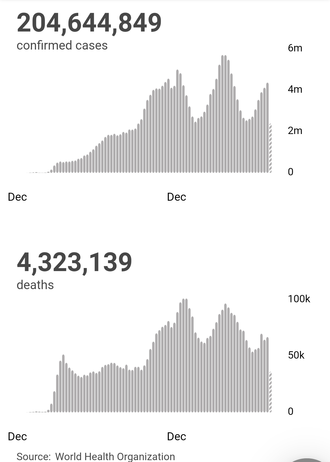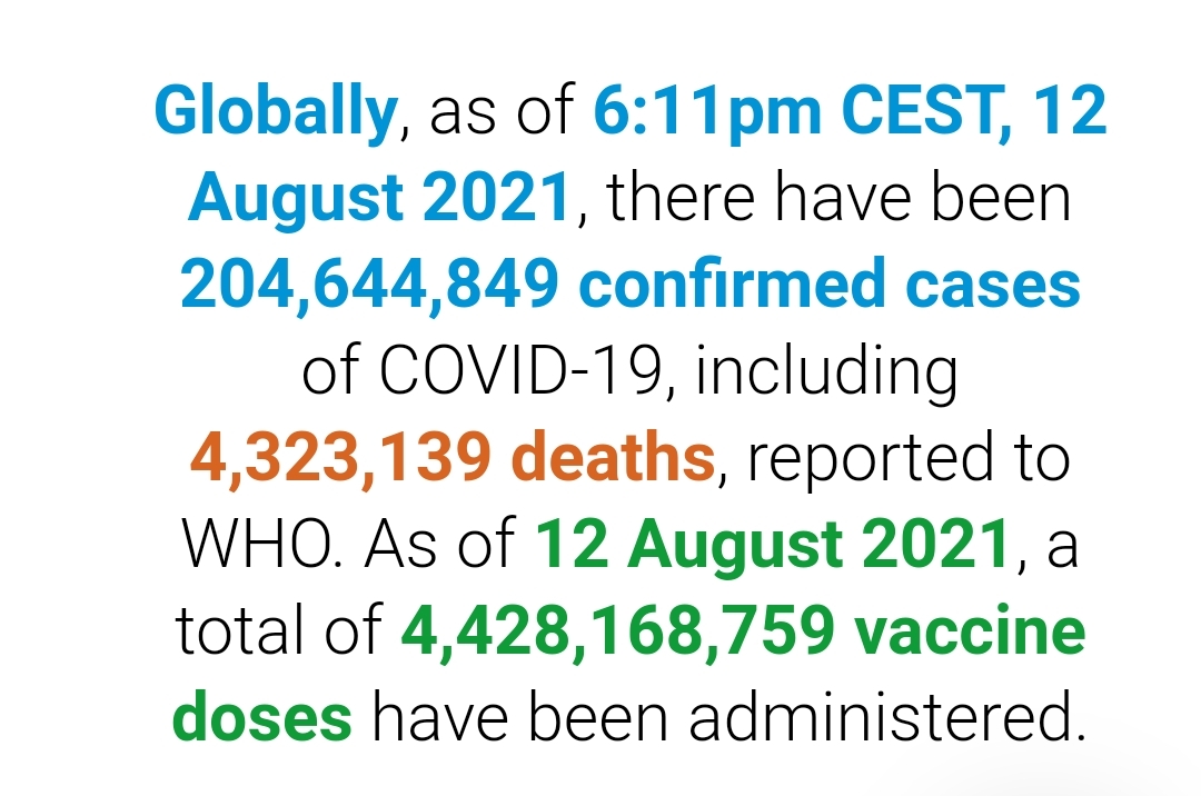 根据世卫组织最新实时统计数据,截至欧洲中部夏令时间8月12日18时11分(北京时间8月13日0时11分),全球新冠肺炎确诊病例累计达204644849例,累计死亡4323139例。