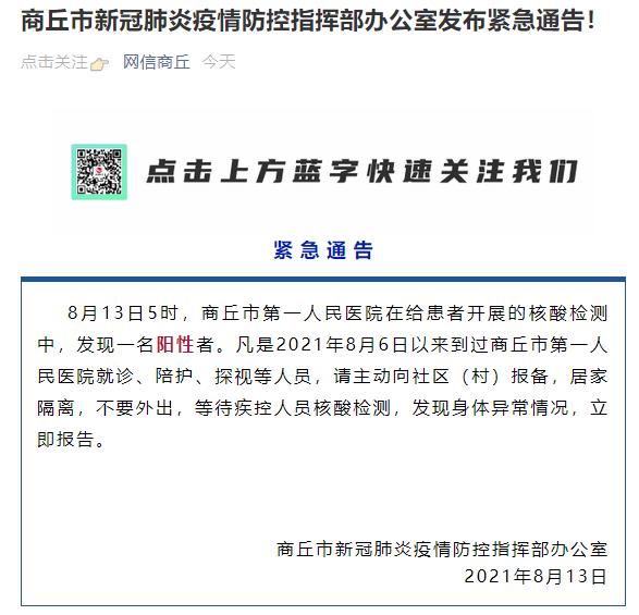 据微信公众号“网信商丘”消息,8月13日5时,河南省商丘市第一人民医院在给患者开展的核酸检测中,发现一名阳性者。凡是2021年8月6日以来到过商丘市第一人民医院就诊、陪护、探视等人员,请主动向社区(村)报备,居家隔离,不要外出,等待疾控人员核酸检测,发现身体异常情况,立即报告。