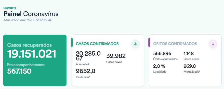 截至当地时间8月12日19时46分,据巴西卫生部发布的数据,该国单日新增新冠肺炎确诊病例39982例,累计确诊20285067例;新增死亡病例1148例,累计死亡566896例;累计治愈病例19151021例。