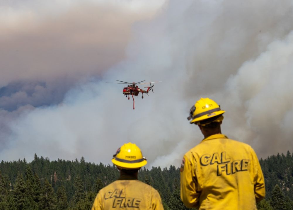 8月5日,一架直升飞机在美国加利福尼亚州北部拉森国家森林扑救迪克西山火。(新华社发,董旭东摄)
