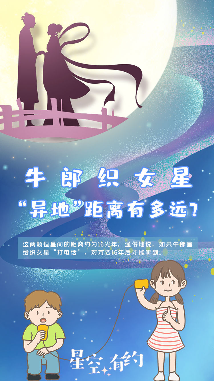 王科超解释说,牛郎星、织女星是两颗恒星,这两颗恒星间的距离约为16光年。“通俗点解释,光一年‘走过’的路程为一光年,也就是说,牛郎星给织女星打电话说‘我爱你’,对方要16年后才能听到。”