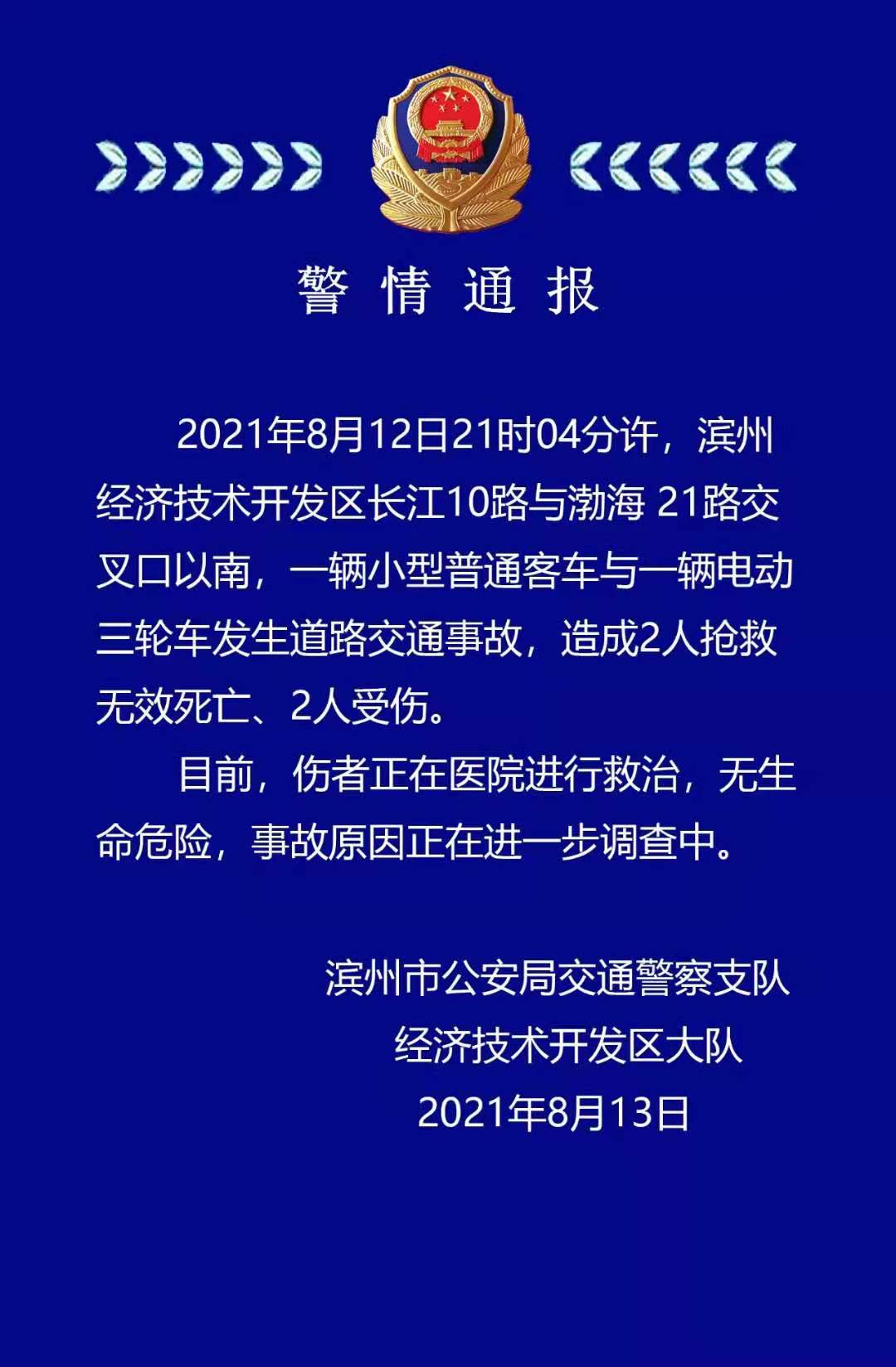 2021年8月12日21时04分许,山东滨州经济技术开发区长江10路与渤海21路交叉口以南,一辆小型普通客车与一辆电动三轮车发生道路交通事故,造成2人抢救无效死亡、2人受伤。