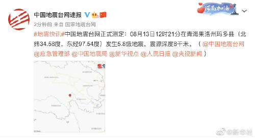#地震快讯#中国地震台网正式测定:08月13日12时21分在青海果洛州玛多县(北纬34.58度,东经97.54度)发生5.8级地震,震源深度8千米。