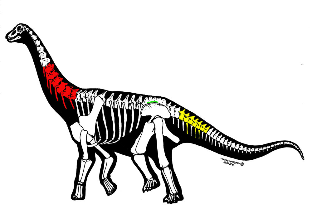 中国丝路巨龙(红色)与新疆哈密巨龙(黄色)及未命名化石(绿色)骨骼保存示意图(毛里利奥·奥利维拉绘,中科院古脊椎所供图)