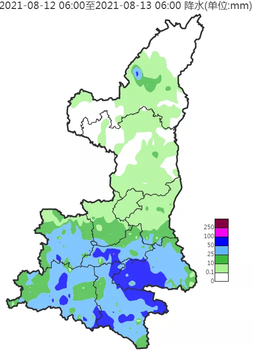 据陕西省气象台数据,8月12日6时一13日6时,陕西陕北大部、关中、陕南共89个区县1597个监测站出现降雨。其中6站大暴雨,239站暴雨。强降雨主要位于西安西部、汉中中部、商洛西部、安康部分地方、宝鸡南部局地、榆林中部局地。最大降雨量出现在西安鄠邑区余下镇站,达到159.4毫米。