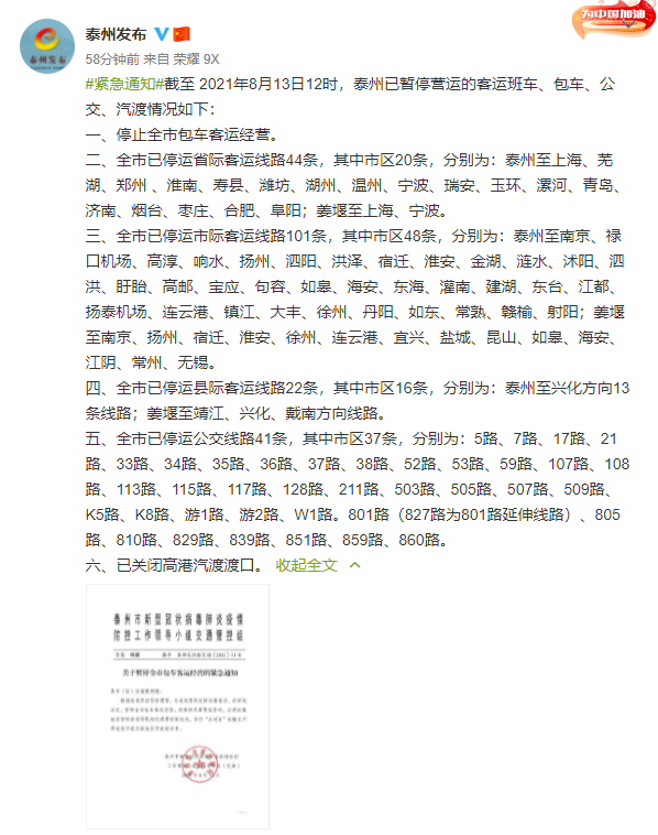 8月13日13时许,江苏泰州市人民政府新闻办公室官方微博发布了泰州已暂停营运的客运班车、包车、公交、汽渡情况。详情如下图: