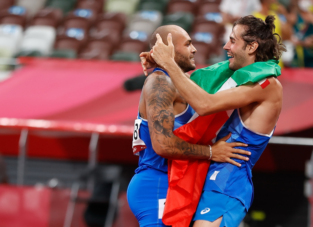 8月1日,夺得意大利跳高冠军的选手坦贝里(右)祝贺随后夺得男子百米冠军的意大利选手雅各布斯(左)。