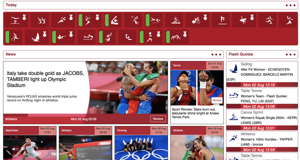 在当天的男子百米大战中,意大利选手雅各布斯成为黑马。我拍摄的他夺冠后和之前五分钟获得男子跳高冠军的意大利人坦贝里的照片随后被奥运会信息服务系统(OIS)作为男子百米大战后当天的页面头图使用。